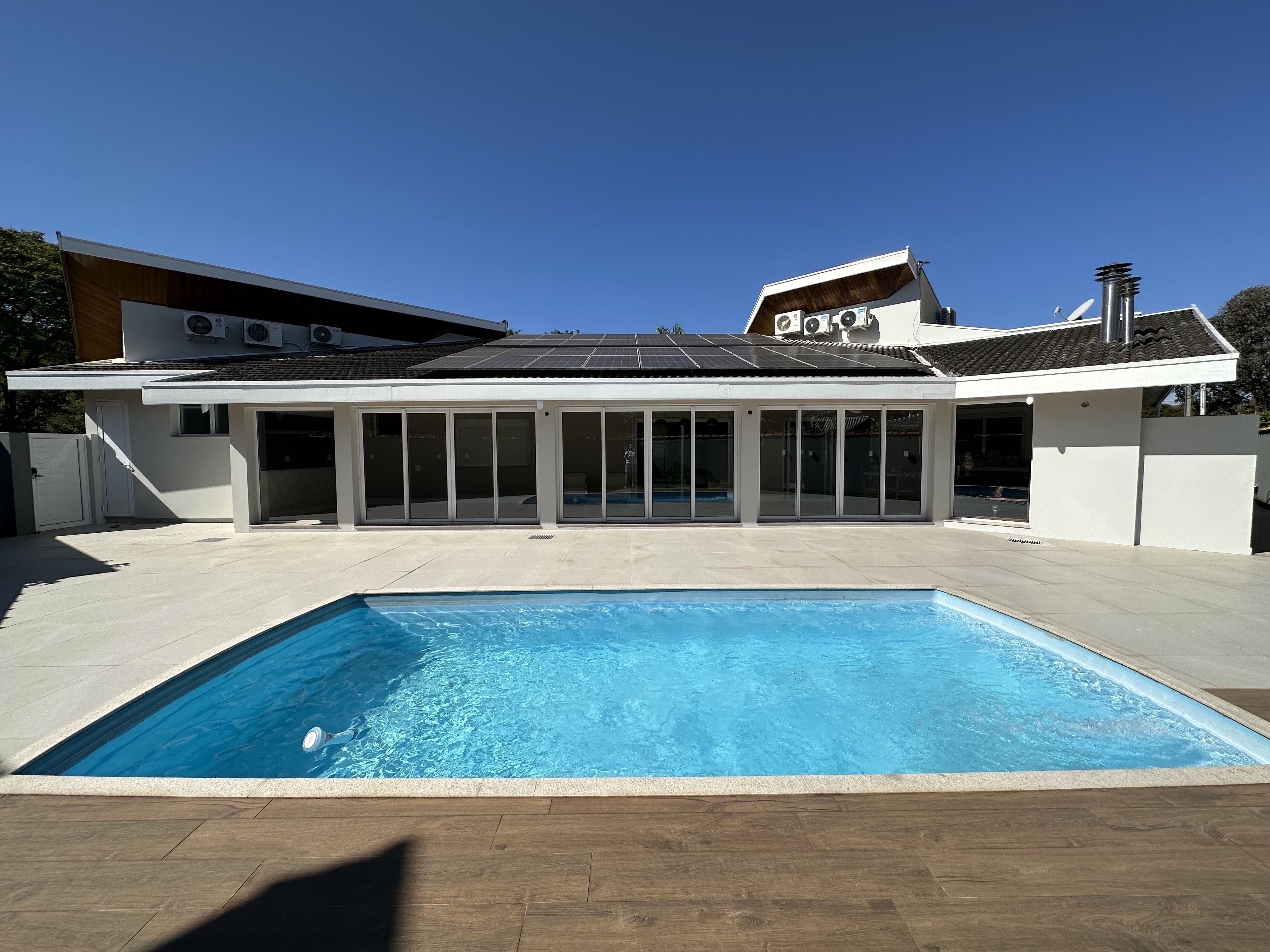 Casa sustentável: a residência possui o que há de melhor em termos de equipamento de energia solar sendo o inversor de alto desempenho da empresa Fronius (https://www.fronius.com/pt-br/brasil) com capacidade de 12KW levando o valor da conta de luz mensal para R$ 150,00/mês em média com alta utilização de ar condicionado.